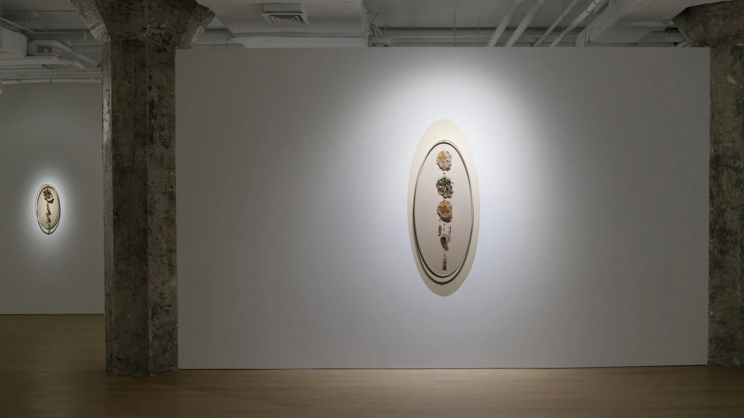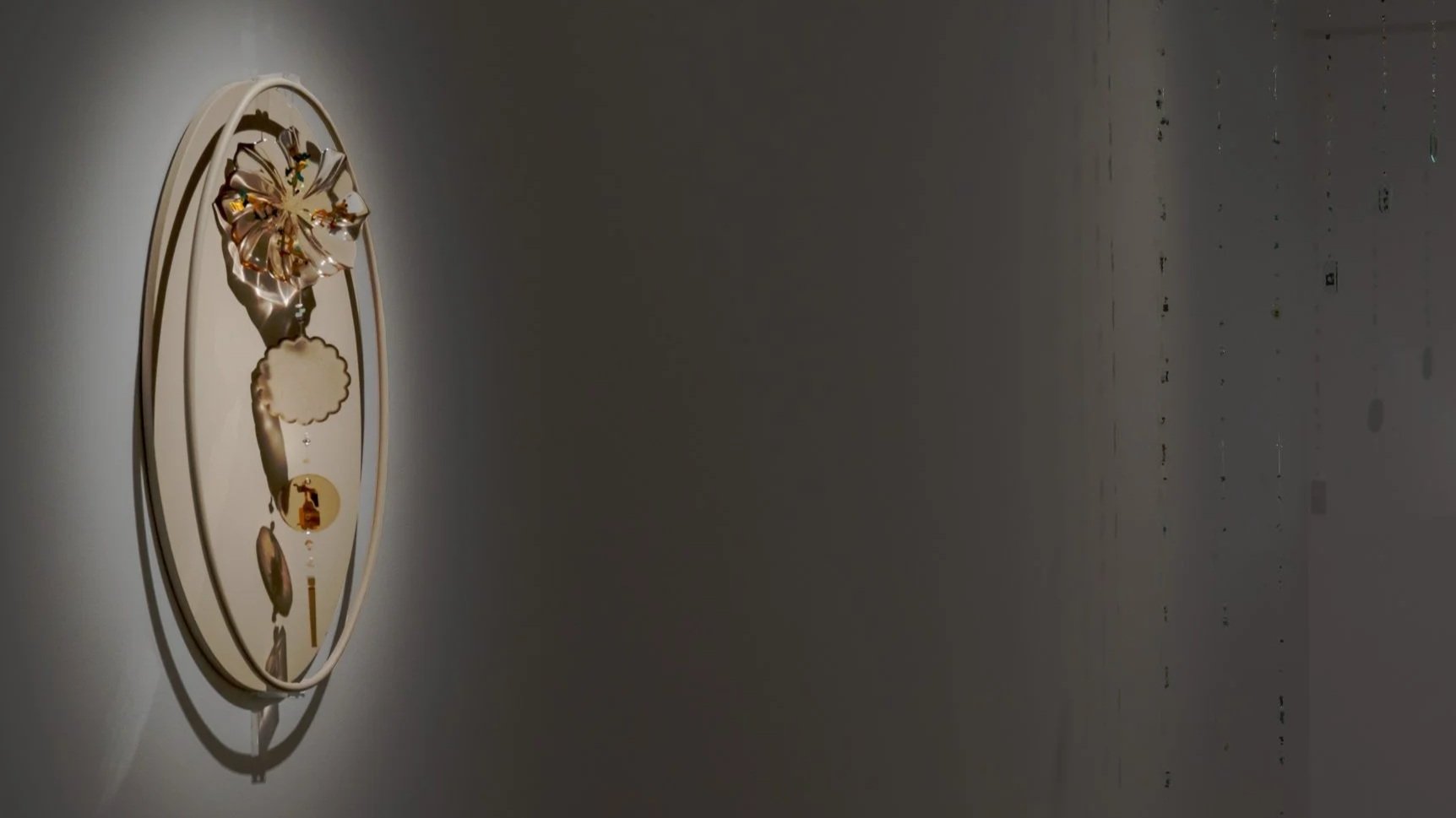 The installation takes the form of a suspended structure, delicately hanging in space. It sways gently with the air currents, emitting a silent “echo,” like drifting fragments of signal floating between time and space. Each unit is composed of dismantled elements from obsolete smartwatches—chips, induction wires, and other miniature parts—embedded in transparent epoxy resin alongside natural stones and pigments. At the center of the piece is a near-circular structure, whose undulating surface evokes the imagery of mountain ranges and oceanic trenches, symbolizing the sedimentation and eventual fading of technological artifacts within a geological time scale. This form simultaneously resembles a macrocosmic landscape and the abstract circuitry of a microchip, blurring the boundary between the natural and the artificial.